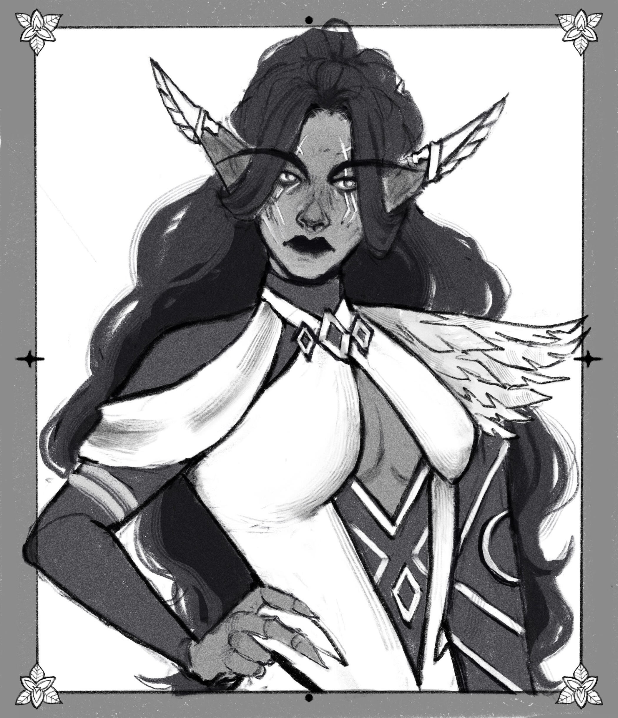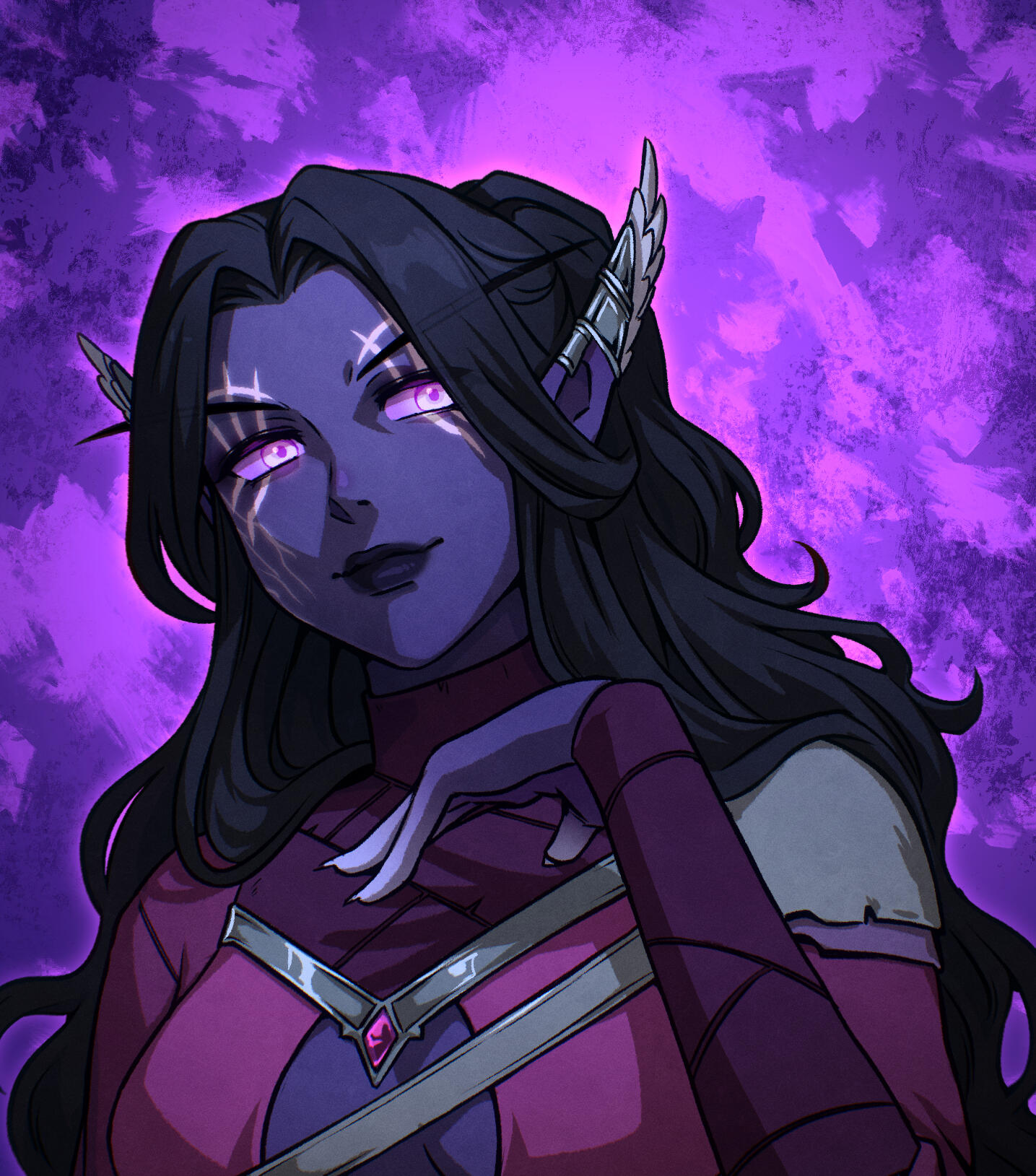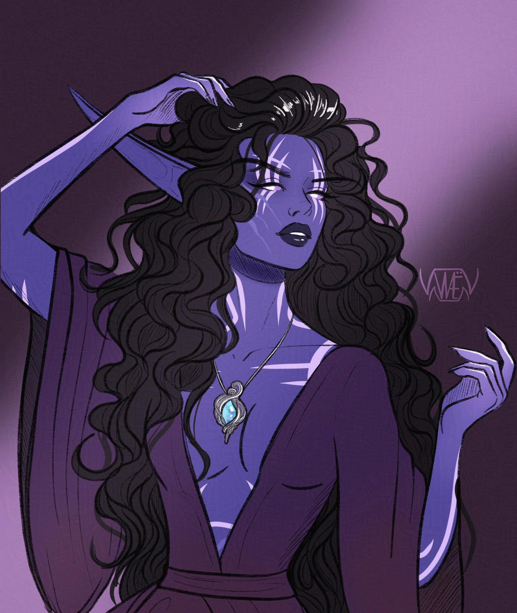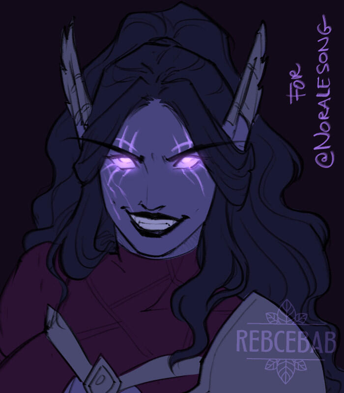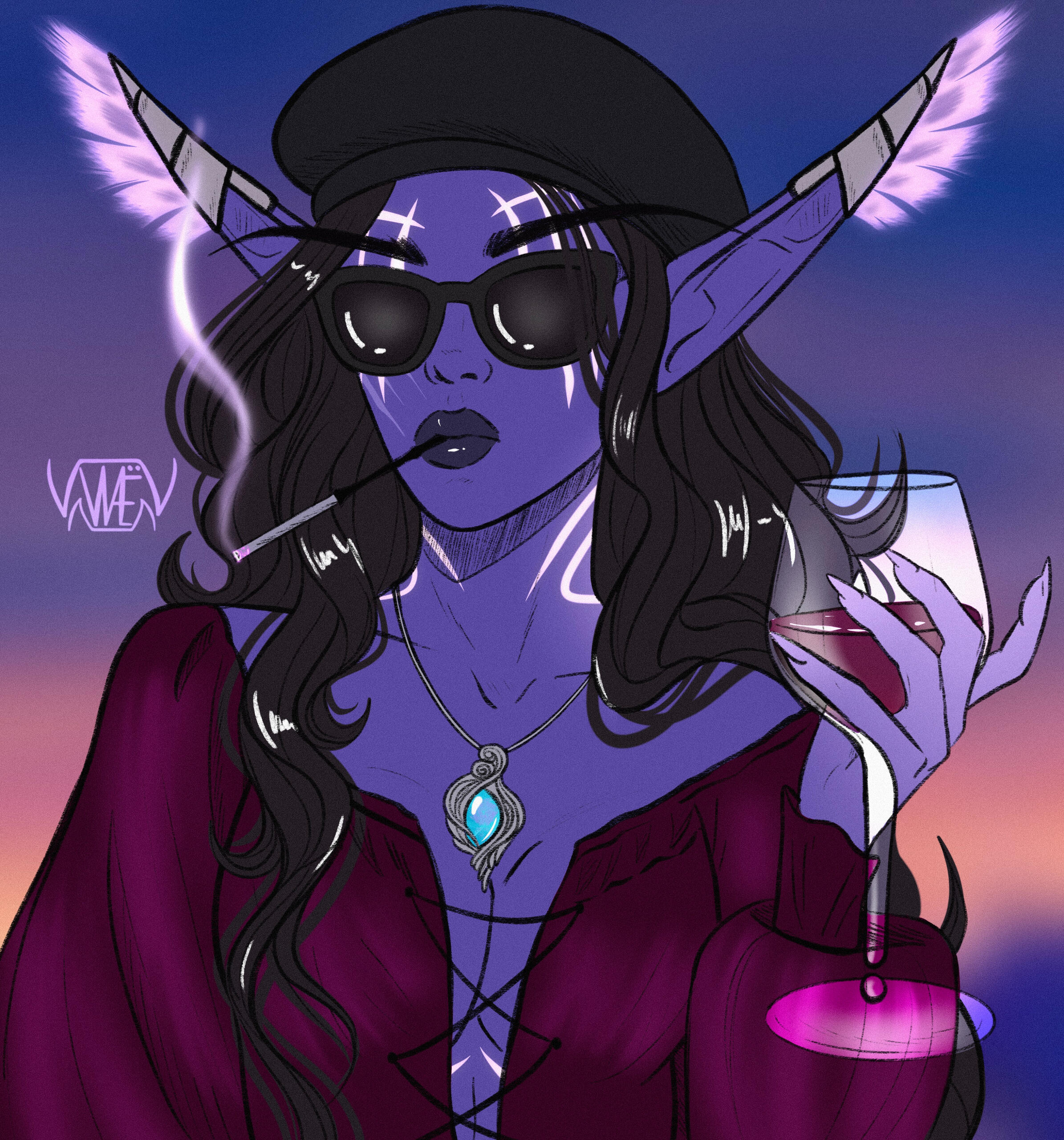 ☄️ Was alive pre-Sundering and part of military units that worked closely with the Rooksguard. She and her twin brother, Lysander, were known as the Twin Fangs of Nar'thalas during the War of the Ancients. Prior to becoming shal'dorei she had orchid pink skin and silver-blue eyes. Her surname at that time was Starfall.☄️ Graduate of Nar'thalas Academy. Top of her class at the time of graduation. Attended with her twin brother, Lysander, and childhood friend, Ilrion.☄️ For those who knew her pre-Sundering, she was mated to a kaldorei turned shal'dorei named Ilrion.☄️ Has a permanent residence in Evermoon Commons and has lived there for the past 10,000 years. She is known amongst her neighbors as Evermoon's Arcanist.☄️ Sells enchantments and inscriptions by commission in Evermoon Commons. Prices are always fair. She is willing to sell them while she's traveling too should someone voice the need for an enchantment. (If she discovers you are noble or Highborne, it is incredibly likely she will refuse to sell to you or price gouge you.)☄️ Was a very active member of the Nightfallen rebellion, though she went under the alias of a masked vigilante and anarchist called the Smiling Saber who wore a blue manasaber mask. She was notorious for torturing and butchering Elisande loyalists to extort them for information. Aside from assassinations, she also helped establish an underground arcwine distribution for citizens who needed it most. However, she was made halfway through the rebellion and imprisoned in Nighthold after being unmasked. At this point, her identity is public knowledge. Most native shal'dorei are aware that she is foul-tempered and does not like to be bothered or recognized for her part in the rebellion.☄️ The Smiling Saber existed before the rebellion and was infamous for being a spellthief who taunted and thieved from aristocracy in Suramar for thousands of years. Her identity was a mystery until her capture in Legion.☄️ Author of a series known as 'The Catspaw' which is a set of tomes that begin with basic and progress to advanced arcane instruction. They were intended for other lowborn elves in Suramar to have access to magic without need for a teacher and were distributed on a black market until the occupation of the Legion ended. They are now published with her name on them, where they were previously printed with no name, and can be purchased in any book stores in Suramar. They have been in circulation for about 1,000 years.☄️ Since the defeat of the Burning Legion, she has traveled Azeroth making star maps.☄️ An accomplished and published astromancy based spellblade. She is always willing to talk shop with other mages.