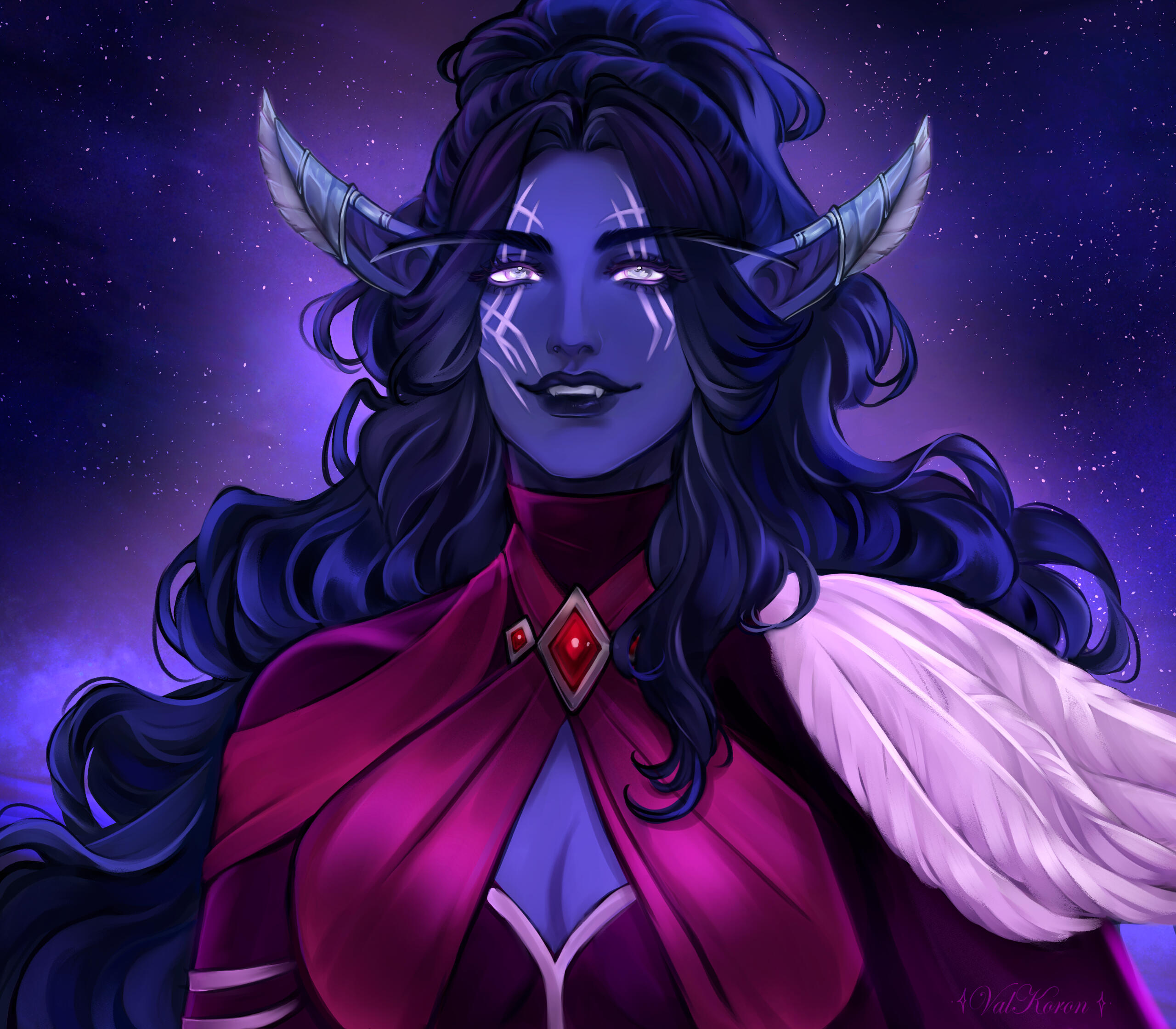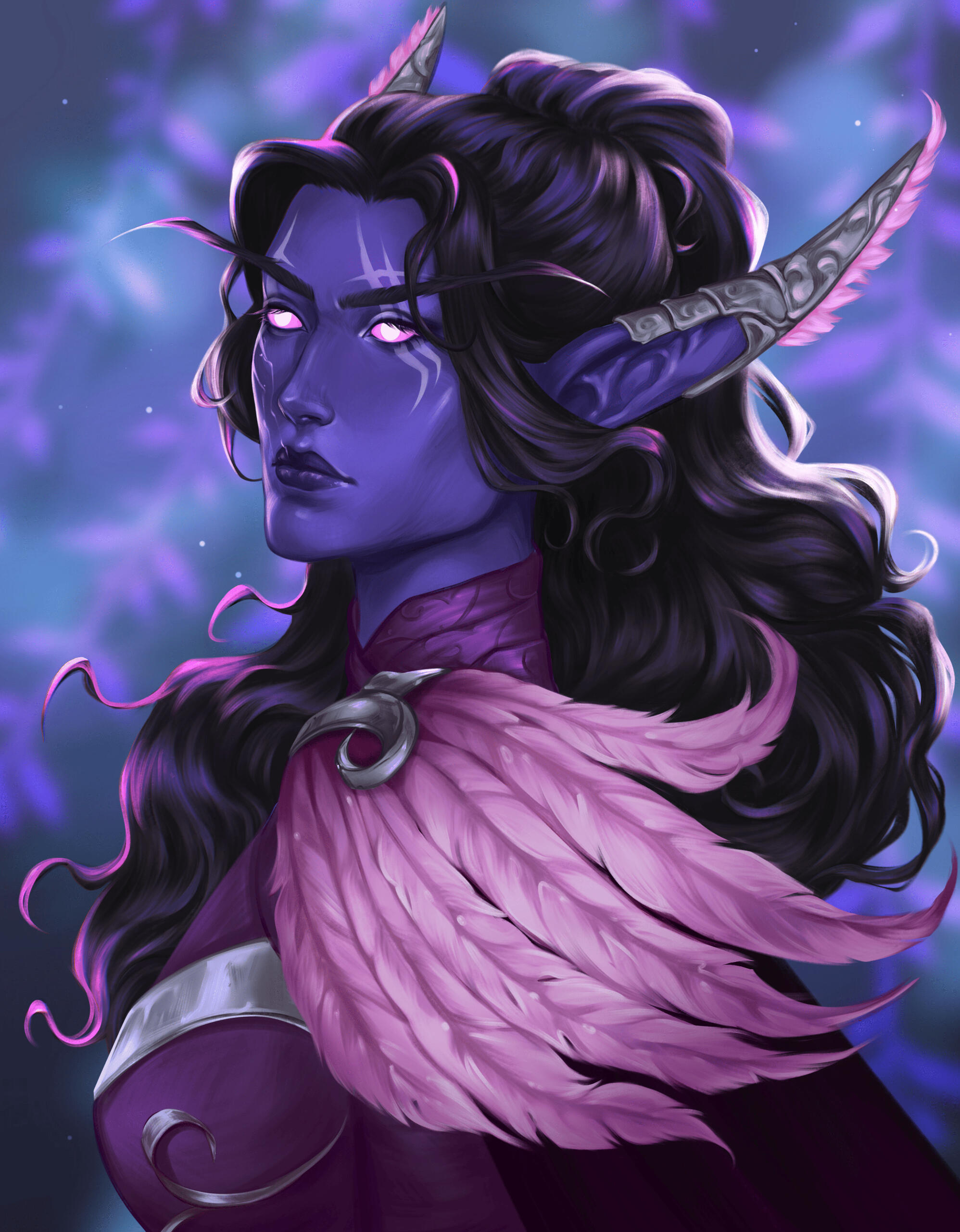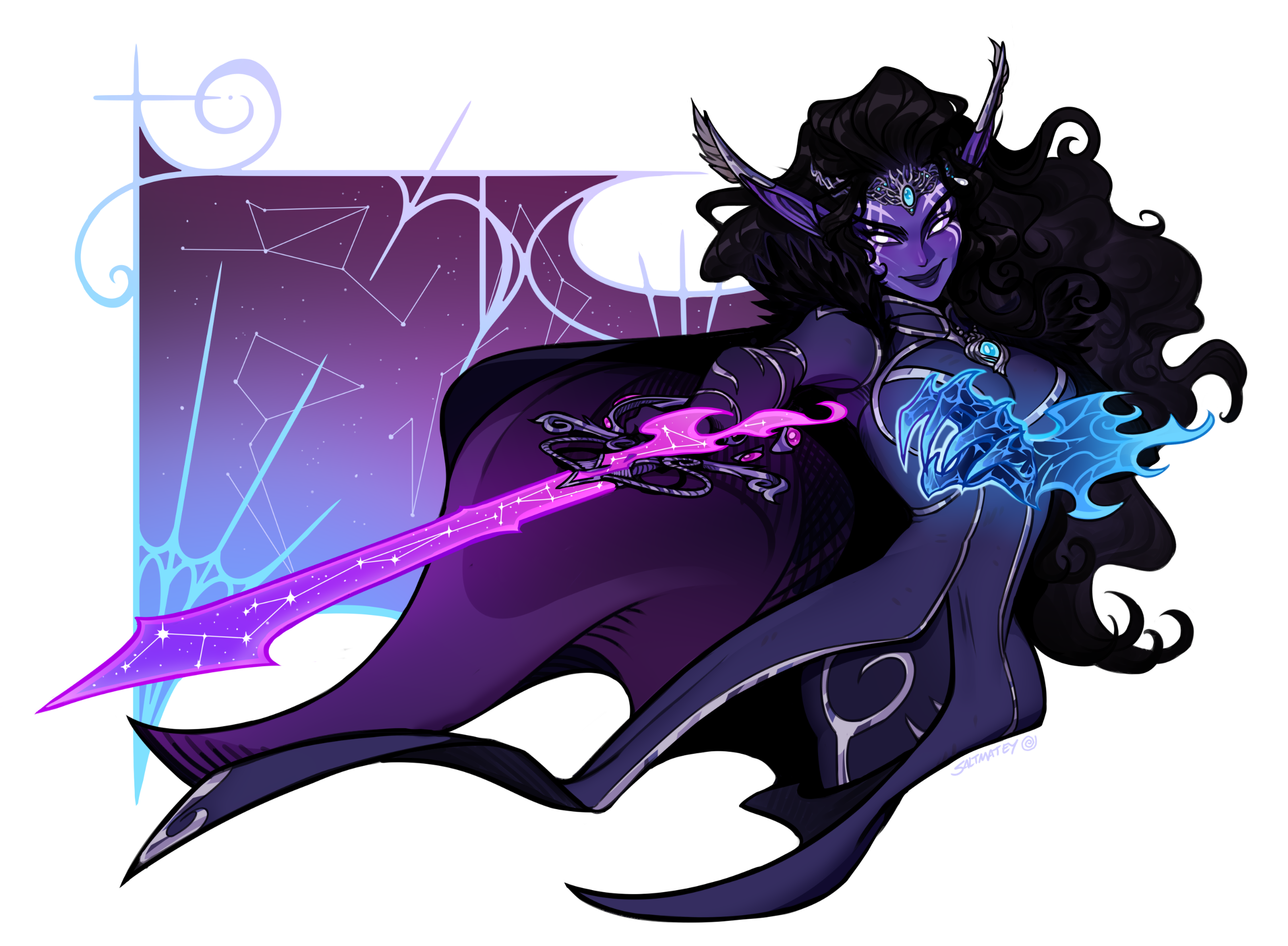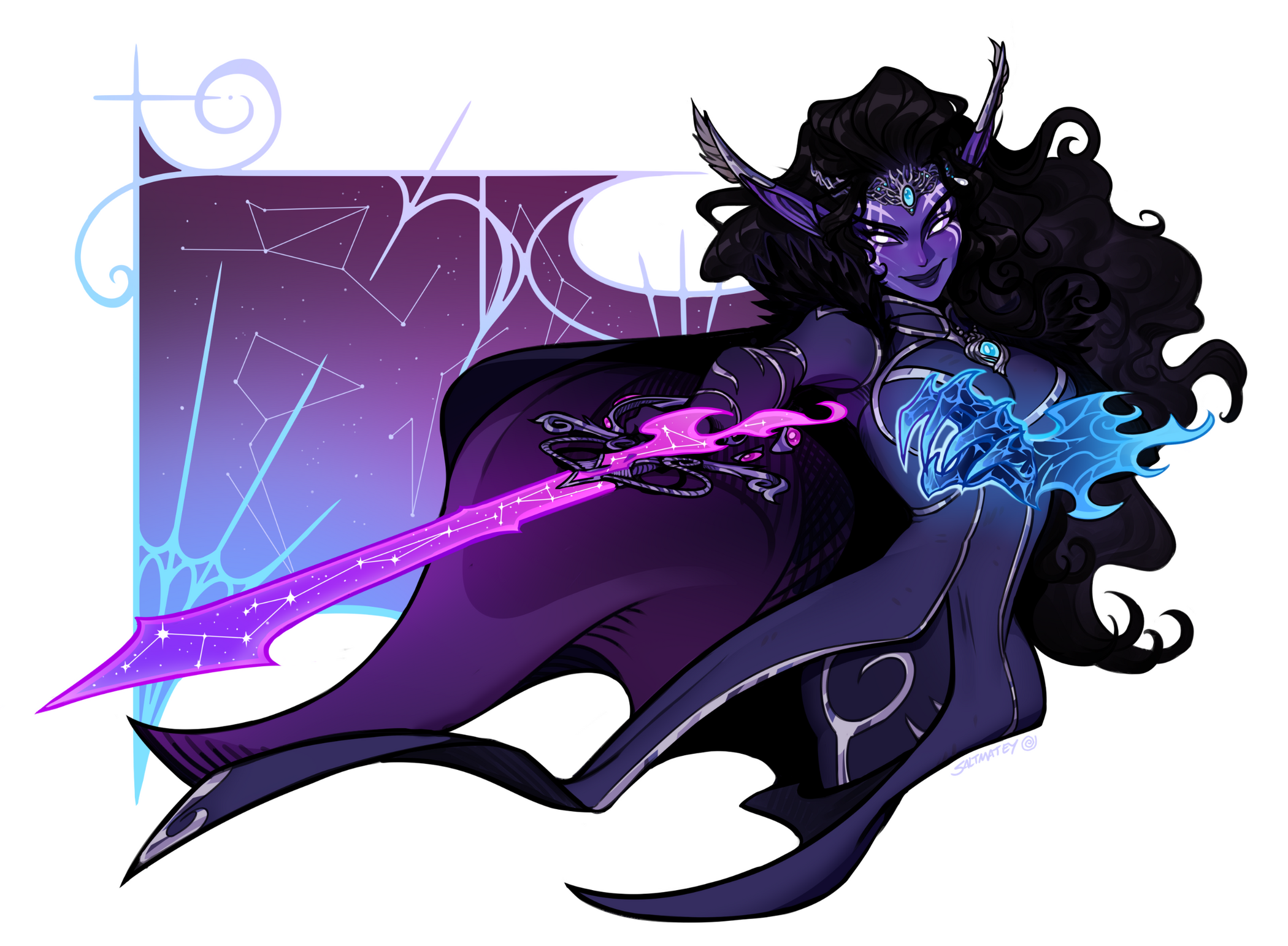 ☄️ Was alive pre-Sundering and part of military units that worked closely with the Rooksguard. She and her twin brother, Lysander, were known as the Twin Fangs of Nar'thalas during the War of the Ancients. Prior to becoming shal'dorei she had orchid pink skin and silver-blue eyes. Her surname at that time was Starfall.☄️ Graduate of Nar'thalas Academy. Top of her class at the time of graduation. Attended with her twin brother, Lysander, and childhood friend, Ilrion.☄️ For those who knew her pre-Sundering, she was mated to a kaldorei turned shal'dorei named Ilrion.☄️ Has a permanent residence in Evermoon Commons and has lived there for the past 10,000 years. She is known amongst her neighbors as Evermoon's Arcanist.☄️ Sells enchantments and inscriptions by commission in Evermoon Commons. Prices are always fair. She is willing to sell them while she's traveling too should someone voice the need for an enchantment. (If she discovers you are noble or Highborne, it is incredibly likely she will refuse to sell to you or price gouge you.)☄️ Was a very active member of the Nightfallen rebellion, though she went under the alias of a masked vigilante and anarchist called the Smiling Saber who wore a blue manasaber mask. She was notorious for torturing and butchering Elisande loyalists to extort them for information. Aside from assassinations, she also helped establish an underground arcwine distribution for citizens who needed it most. However, she was made halfway through the rebellion and imprisoned in Nighthold after being unmasked. At this point, her identity is public knowledge. Most native shal'dorei are aware that she is foul-tempered and does not like to be bothered or recognized for her part in the rebellion.☄️ The Smiling Saber existed before the rebellion and was infamous for being a spellthief who taunted and thieved from aristocracy in Suramar for thousands of years. Her identity was a mystery until her capture in Legion.☄️ Author of a series known as 'The Catspaw' which is a set of tomes that begin with basic and progress to advanced arcane instruction. They were intended for other lowborn elves in Suramar to have access to magic without need for a teacher and were distributed on a black market until the occupation of the Legion ended. They are now published with her name on them, where they were previously printed with no name, and can be purchased in any book stores in Suramar. They have been in circulation for about 1,000 years.☄️ Since the defeat of the Burning Legion, she has traveled Azeroth making star maps.☄️ An accomplished and published astromancy based spellblade. She is always willing to talk shop with other mages.