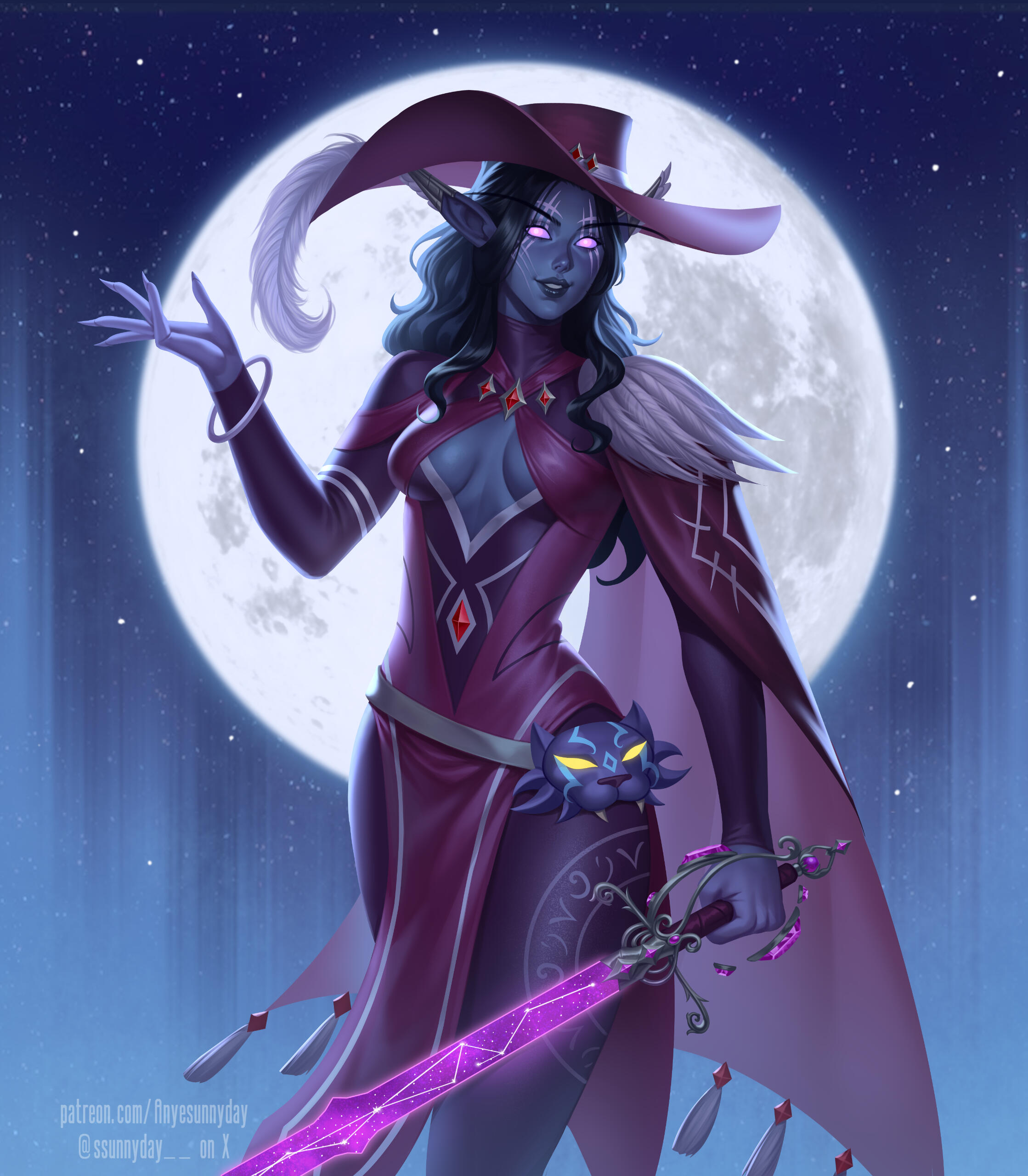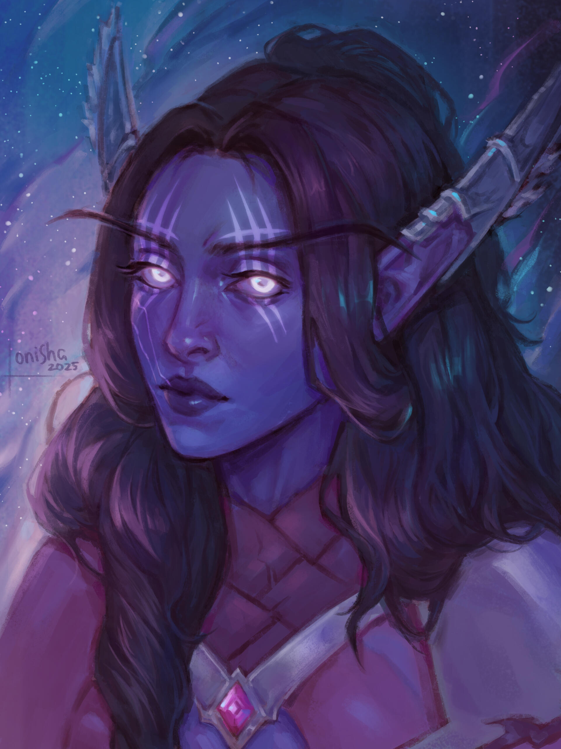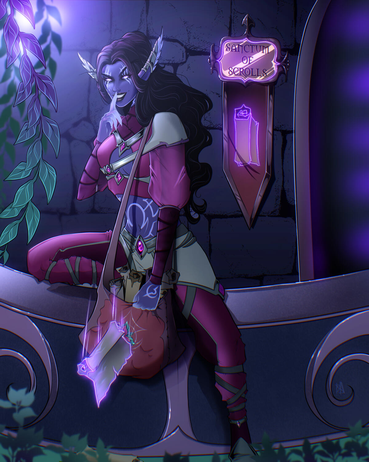 ☄️ Was alive pre-Sundering and part of military units that worked closely with the Rooksguard. She and her twin brother, Lysander, were known as the Twin Fangs of Nar'thalas during the War of the Ancients. Prior to becoming shal'dorei she had orchid pink skin and silver-blue eyes. Her surname at that time was Starfall.☄️ Graduate of Nar'thalas Academy. Top of her class at the time of graduation. Attended with her twin brother, Lysander, and childhood friend, Ilrion.☄️ For those who knew her pre-Sundering, she was mated to a kaldorei turned shal'dorei named Ilrion.☄️ Has a permanent residence in Evermoon Commons and has lived there for the past 10,000 years. She is known amongst her neighbors as Evermoon's Arcanist.☄️ Sells enchantments and inscriptions by commission in Evermoon Commons. Prices are always fair. She is willing to sell them while she's traveling too should someone voice the need for an enchantment. (If she discovers you are noble or Highborne, it is incredibly likely she will refuse to sell to you or price gouge you.)☄️ Was a very active member of the Nightfallen rebellion, though she went under the alias of a masked vigilante and anarchist called the Smiling Saber who wore a blue manasaber mask. She was notorious for torturing and butchering Elisande loyalists to extort them for information. Aside from assassinations, she also helped establish an underground arcwine distribution for citizens who needed it most. However, she was made halfway through the rebellion and imprisoned in Nighthold after being unmasked. At this point, her identity is public knowledge. Most native shal'dorei are aware that she is foul-tempered and does not like to be bothered or recognized for her part in the rebellion.☄️ The Smiling Saber existed before the rebellion and was infamous for being a spellthief who taunted and thieved from aristocracy in Suramar for thousands of years. Her identity was a mystery until her capture in Legion.☄️ Author of a series known as 'The Catspaw' which is a set of tomes that begin with basic and progress to advanced arcane instruction. They were intended for other lowborn elves in Suramar to have access to magic without need for a teacher and were distributed on a black market until the occupation of the Legion ended. They are now published with her name on them, where they were previously printed with no name, and can be purchased in any book stores in Suramar. They have been in circulation for about 1,000 years.☄️ Since the defeat of the Burning Legion, she has traveled Azeroth making star maps.☄️ An accomplished and published astromancy based spellblade. She is always willing to talk shop with other mages.